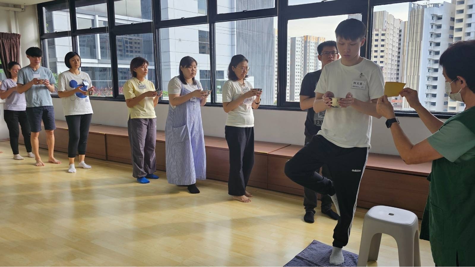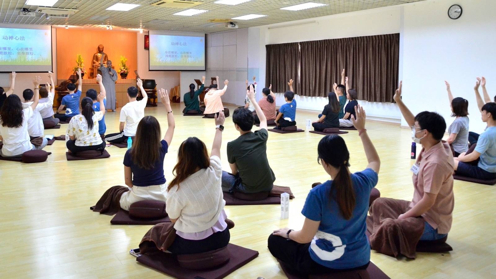 第3周下午, 学员欢喜地在小组分享过去一周的禅坐心得。大家之后跟随投影里的引导员做8式动禅,体验当下身体肌肉拉伸及放松的感觉。 接着,学员在演可法师的口述下,渐渐地进入禅定状态,整个禅坐过程维持2支香(1支香大约20分钟)。